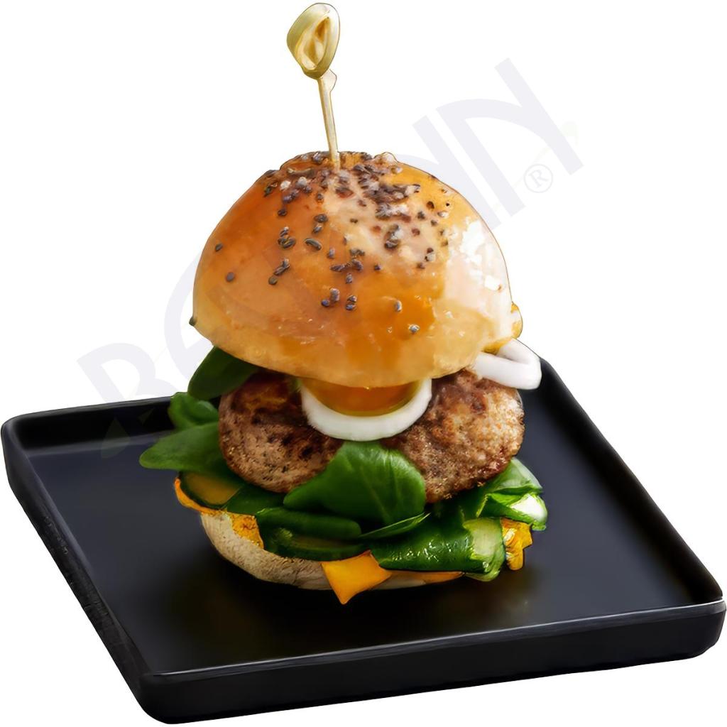 Ta elegantni, kvadratni krožnik je popolna izbira za serviranje finger fooda, prigrizkov in predjedi. Izdelan je iz visokokakovostnega melamina, ki mu daje izjemno trpežnost in eleganten videz, podoben keramiki. S svojo kompaktno velikostjo 12x12 cm je idealen za catering in posebne dogodke, kjer je potrebna estetsko privlačna, a hkrati praktična rešitev. Črna barva doda prefinjenost in poudari vsebino krožnika, kar bo zagotovo navdušilo vaše goste.