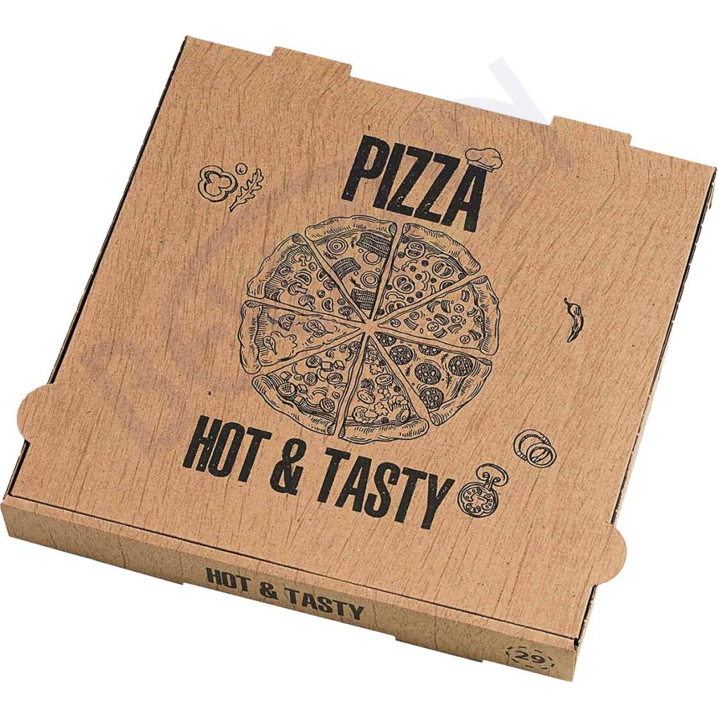 Izdelana je iz valovitega kartona. Ta visokokakovostna rjava embalaža za pico preprečuje prodiranje maščob in vlage, kar je idealno za pakiranje sveže pripravljenih pic. Zagotavlja zadostno izolacijo, da naročila ostanejo vroča in pripravljena za stranke. Na sprednji in zadnji gornji strani so odprtine, da se zmanjša kondenzacija na pultih.