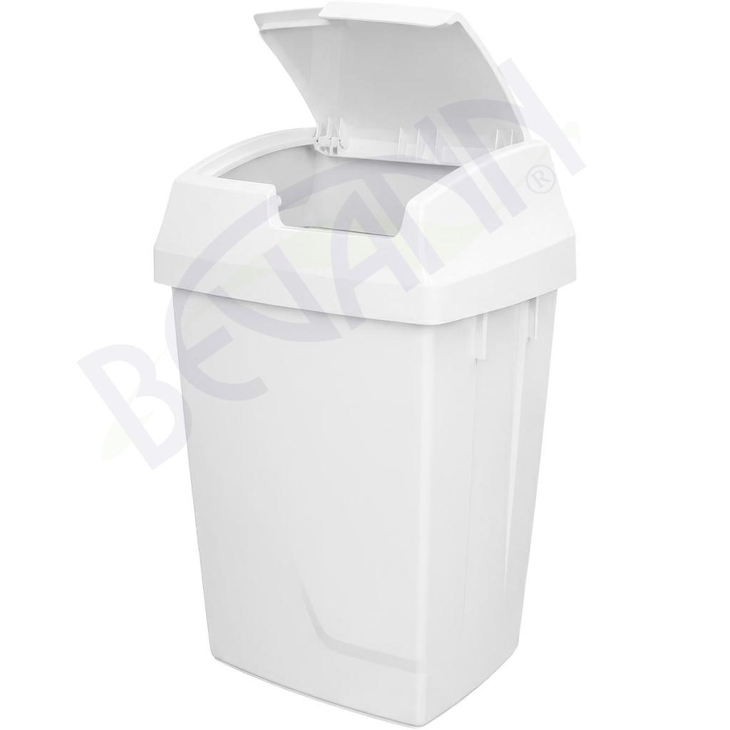 Material: PSV kopolimer polipropilen Barva: Bela Kapaciteta: 50 L Dimenzije: Širina 31,5 cm, dolžina 39 cm, višina 67 cm Teža: 1,85 kg Priporočena velikost vrečk: 65 x 65 cm Značilnosti pokrova: Nihajni sistem z odpiranjem, odpornim na udarce